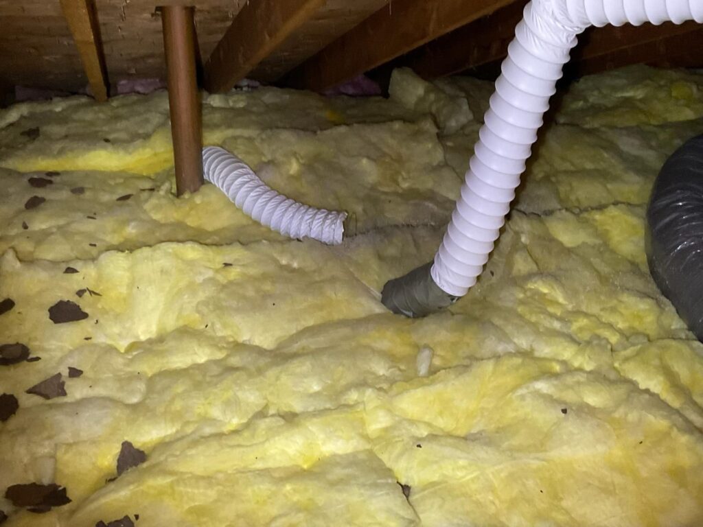 Every bathroom exhaust fan is designed to pull humid air out of the bathroom and route it through a duct to the exterior of the home — typically through the roof, a soffit, or a gable wall. The problem: that duct runs through the attic, and in many homes, the flexible duct has pulled loose from its connection point. The fan still runs. The bathroom still sounds like it’s working. But the moist air is now dumping directly into the attic cavity.