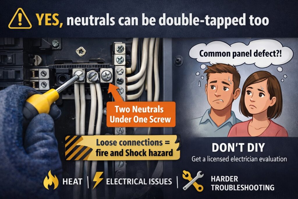 For electrical panel safety, proper neutral connections are non-negotiable. Unlike double tapped breakers (which are also problematic), double tapped neutrals often escape notice during casual inspections.